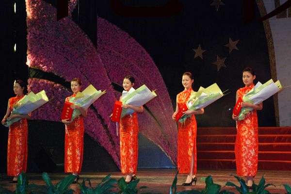 3.禮儀小姐隨頒獎?wù)呱砗笊吓_。